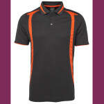 moisture removal microknit, snag resistant easy care fabric. Self fabric binding finishes neck and armholes, contrast side panels with back neck reflective tab for ear phones.